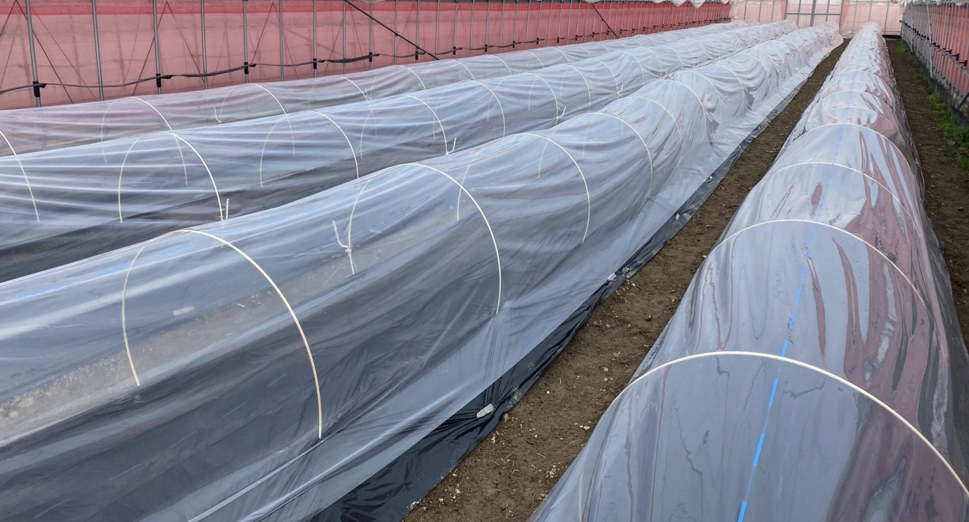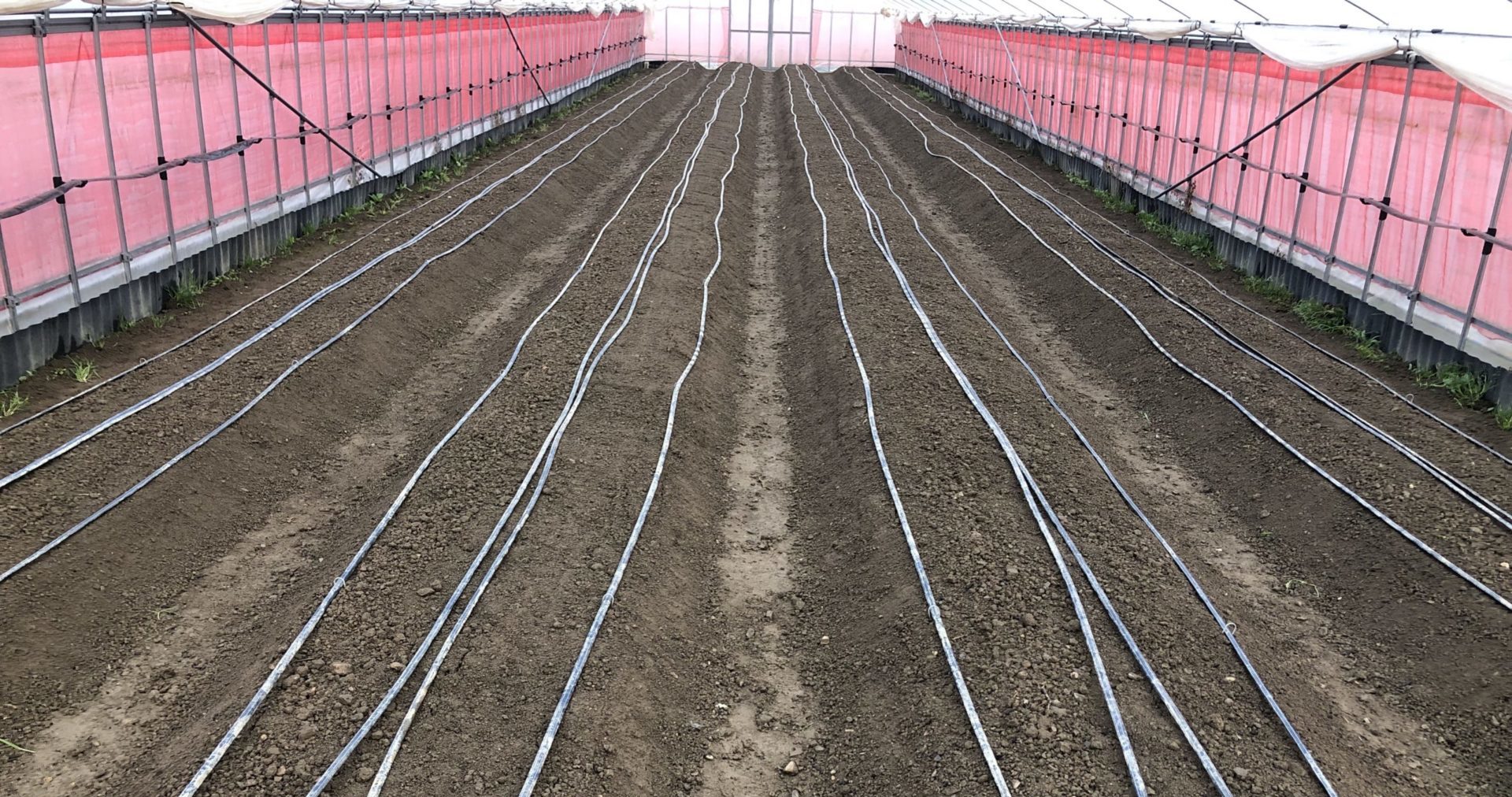 ハウス内に畝を作り、その上に潅水用のチューブを設置します